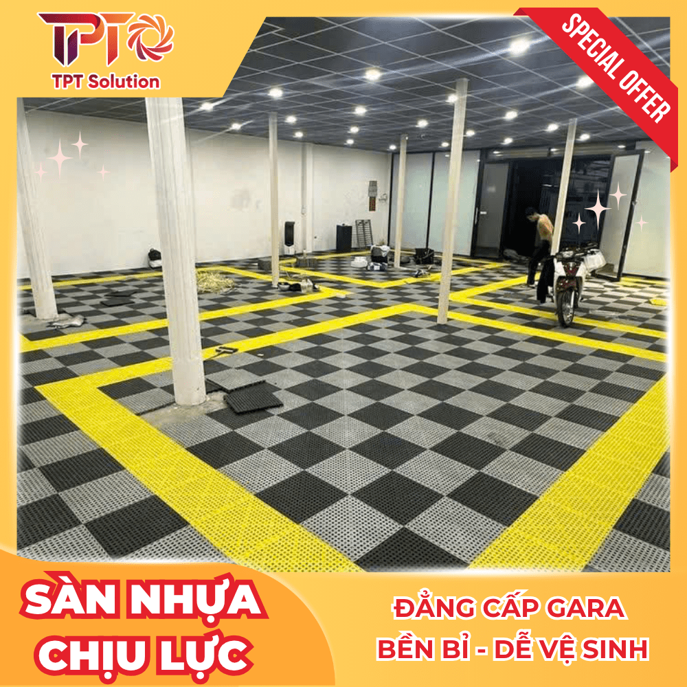 Sàn Nhựa Chịu Lực Mô-đun: Giải pháp lát sàn chịu tải vượt trội, có khả năng thoát nước, chống trượt. Biến khu vực Gara, Workshop thành không gian sạch sẽ, bền bỉ và đẳng cấp về mặt thị giác.